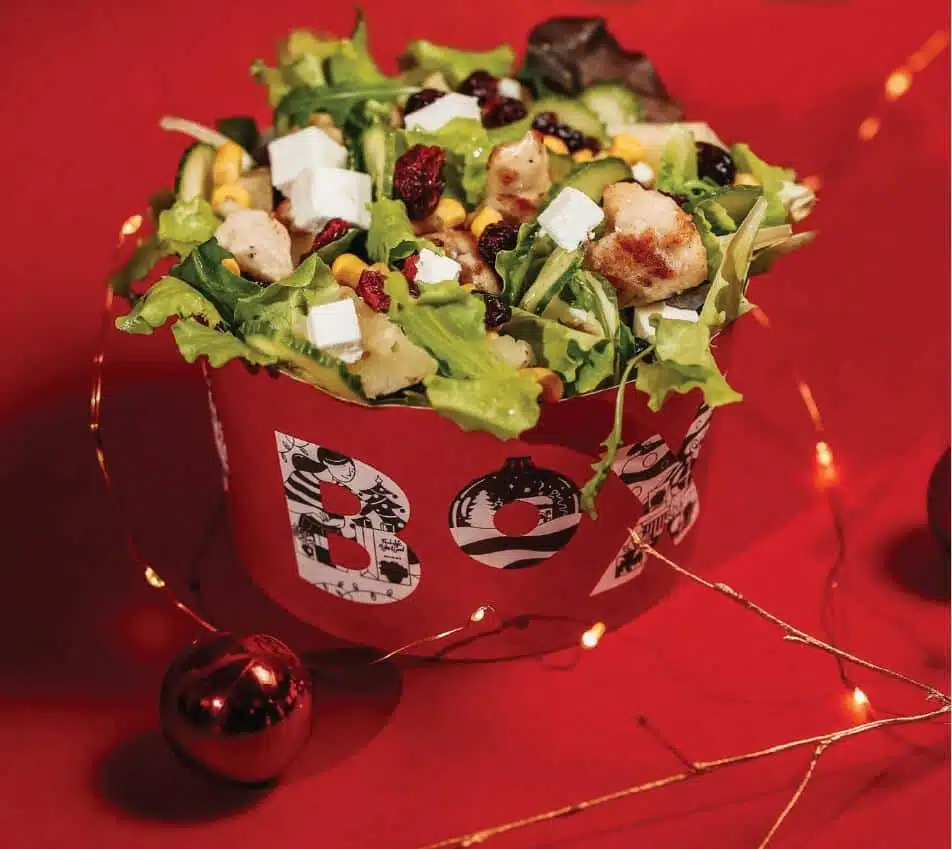 saláta, ananász, feta, uborka, kukorica, aszalt áfonya, grillezett csirkemell
