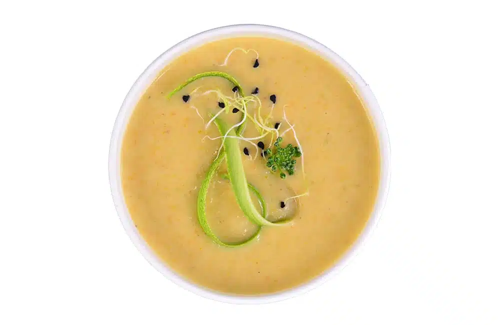 répa, zeller, lilahagyma, burgonya, fokhagyma, cukkini, növényi tejszín, só, bors