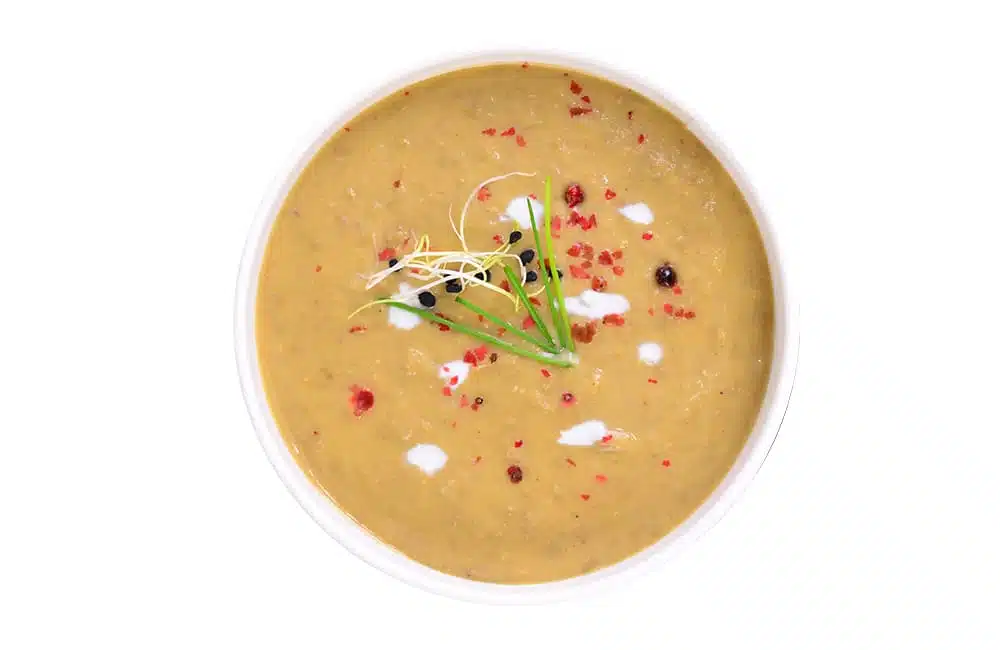 répa, zeller, lilahagyma, burgonya, fokhagyma, zöldlencse, növényi tejszín, só, bors